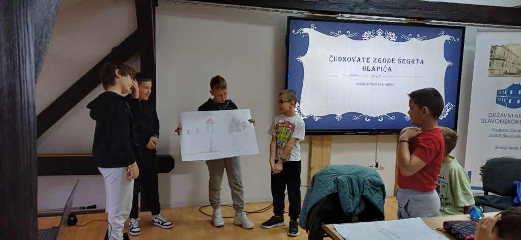 Radionicu „Čudnovate zgode šegrta Hlapića“ vodile su djelatnice DASB-a Ivana Dadić i Gordana Slanček. Učenici su se upoznali s najstarijom Matičnom knjigom krštenih iz Velike Kopanice (1725. – 1745.), koja se čuva u arhivu.