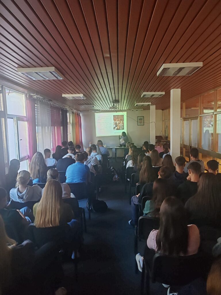 SLAVONSKI BROD – 5. studenoga 2025. U Gimnaziji “Matija Mesić” u Slavonskom Brodu prigodnim programom obilježena je 1100. obljetnica Hrvatskog Kraljevstva. U okviru programa dr. sc. Marija Karbić, predstojnica Hrvatskog instituta za povijest – Podružnice za povijest Slavonije, Srijema i Baranje, održala je predavanje o kralju Tomislavu. Učenici 2. razreda Gimnazije pod mentorstvom prof. Danijele Zekušić priredili su izložbu “Obilježavanje 1100. obljetnice Hrvatskog Kraljevstva”, a učenici 4. razreda pod mentorstvom prof. Jelene Jakovljević priredili su izložbe “Promidžbeni plakat: 1100. godina Hrvatskog Kraljevstva” i “Identifikacijski kod”.